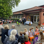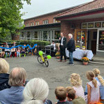 Zum Beginn der Veranstaltung wurde das Fahrrad mit einigen kurzen Grußworten von Herrn Tölle und Herrn Wilcken der Schule übergeben. Herr Wilcken gab den Schülerinnen und Schüler mit auf den Weg, dass sie sich jetzt nicht nur in das Abenteuer Schule, sondern auch in das Abenteuer Straßenverkehr begeben. Mit einem „kleinen Augenzwinkern“ bat er die Eltern, beim sogenannten „Elterntaxi“ nicht unbedingt bis in Klassenzimmer zu fahren.